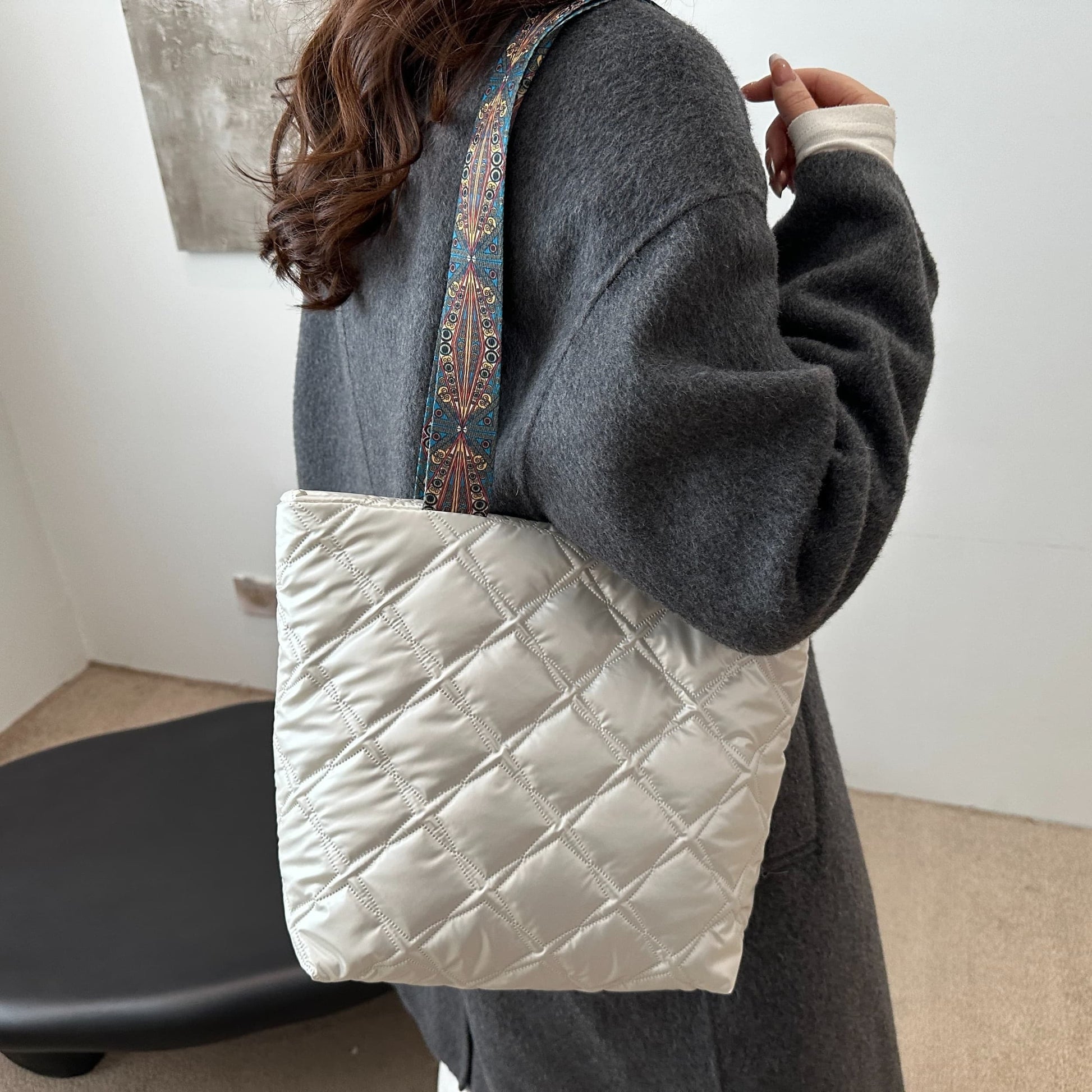 Gesteppte Handtasche aus PU-Leder mit bedrucktem Riemen
