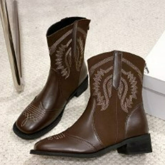 Embroidered Lace-Up Block Heel Boots