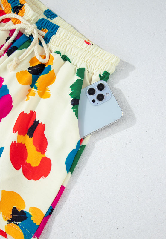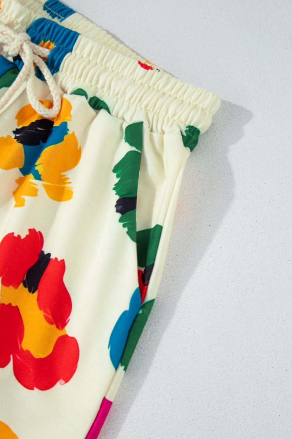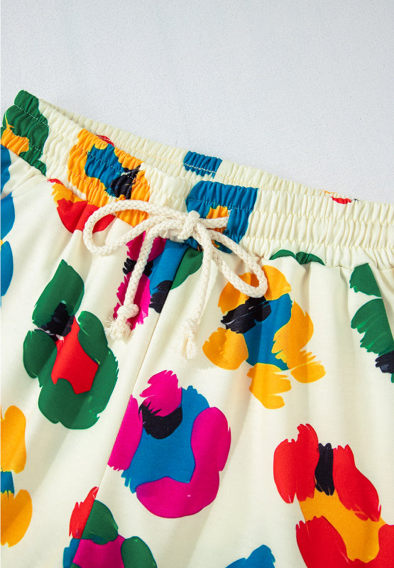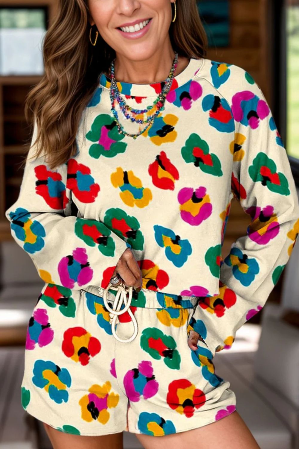 Leopard Round Neck Long Sleeve Top and Drawstring Shorts Set