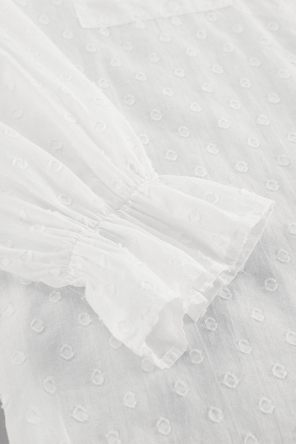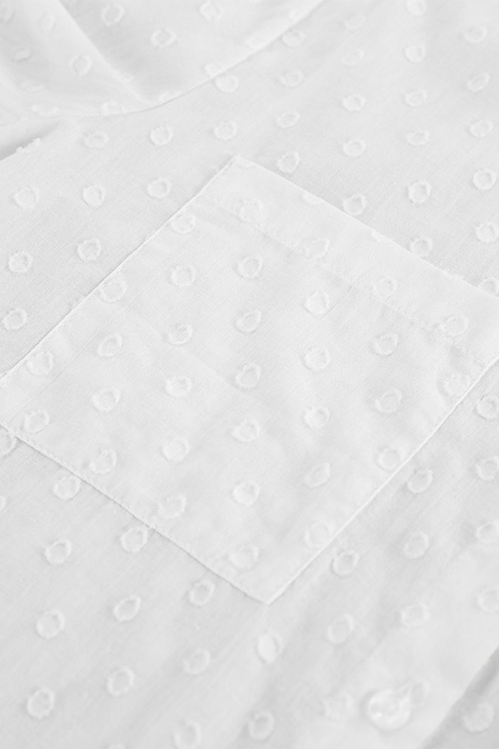 - Features: Buttoned, Pocketed, Ruffled, Swiss Dot