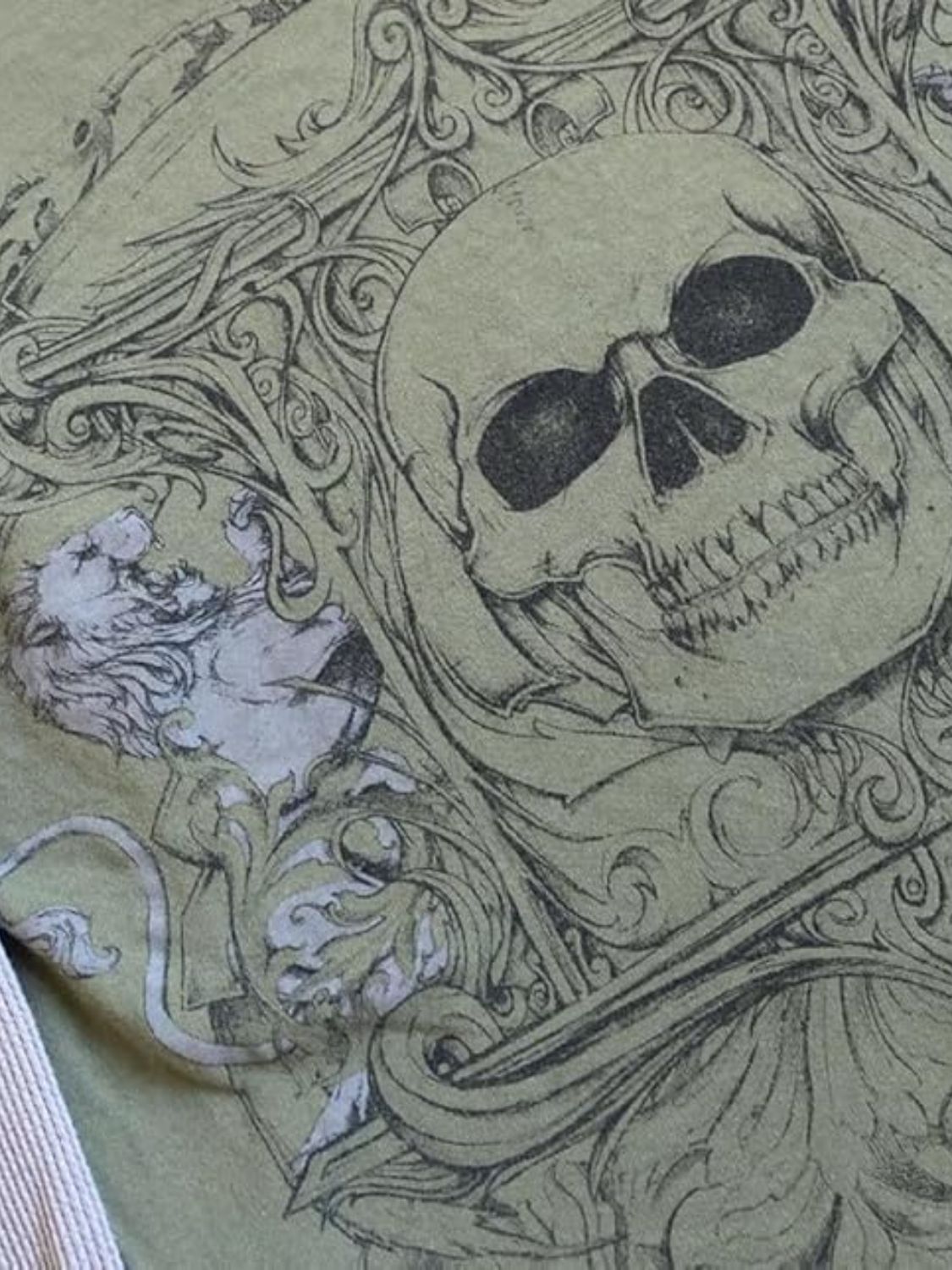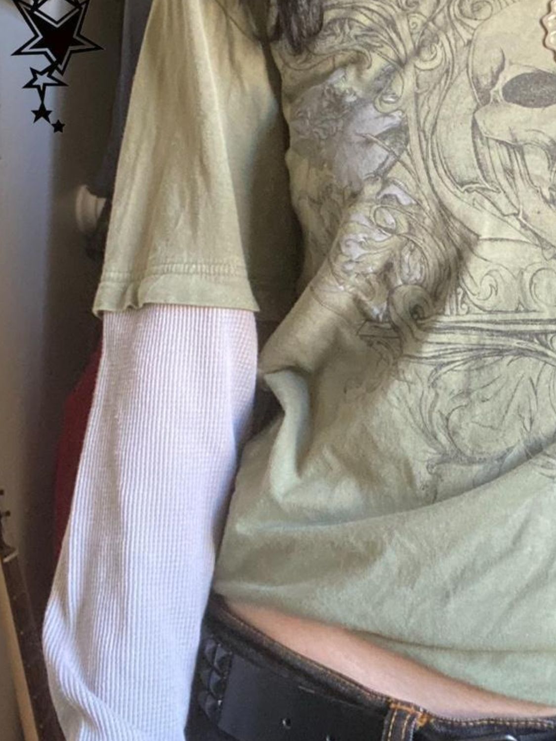 Skull Round Neck Long Sleeve Fake Two Pieces T-Shirt